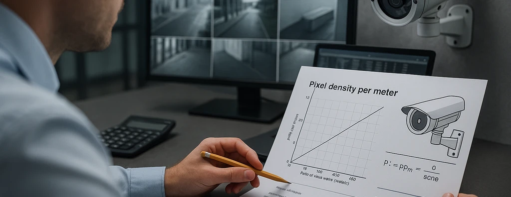 A densidade de pixels por metro (ppm) é uma métrica fundamental para a avaliação e dimensionamento de sistemas de vigilância por vídeo, sendo determinante na capacidade do sistema em atender aos diferentes requisitos operacionais: detecção, observação, reconhecimento e identificação. Segundo as diretrizes da ABNT NBR IEC 62676, o parâmetro ppm é resultado da razão entre o número de pixels disponíveis na largura do campo de visão e a largura real da área monitorada.