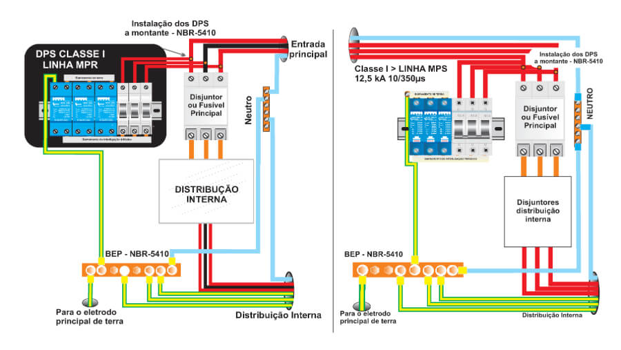 Aplicação: A instalação a montante é indicada quando o DPS precisa proteger toda a instalação, incluindo os disjuntores, de uma sobretensão que pode ocorrer a partir da rede de alimentação externa.